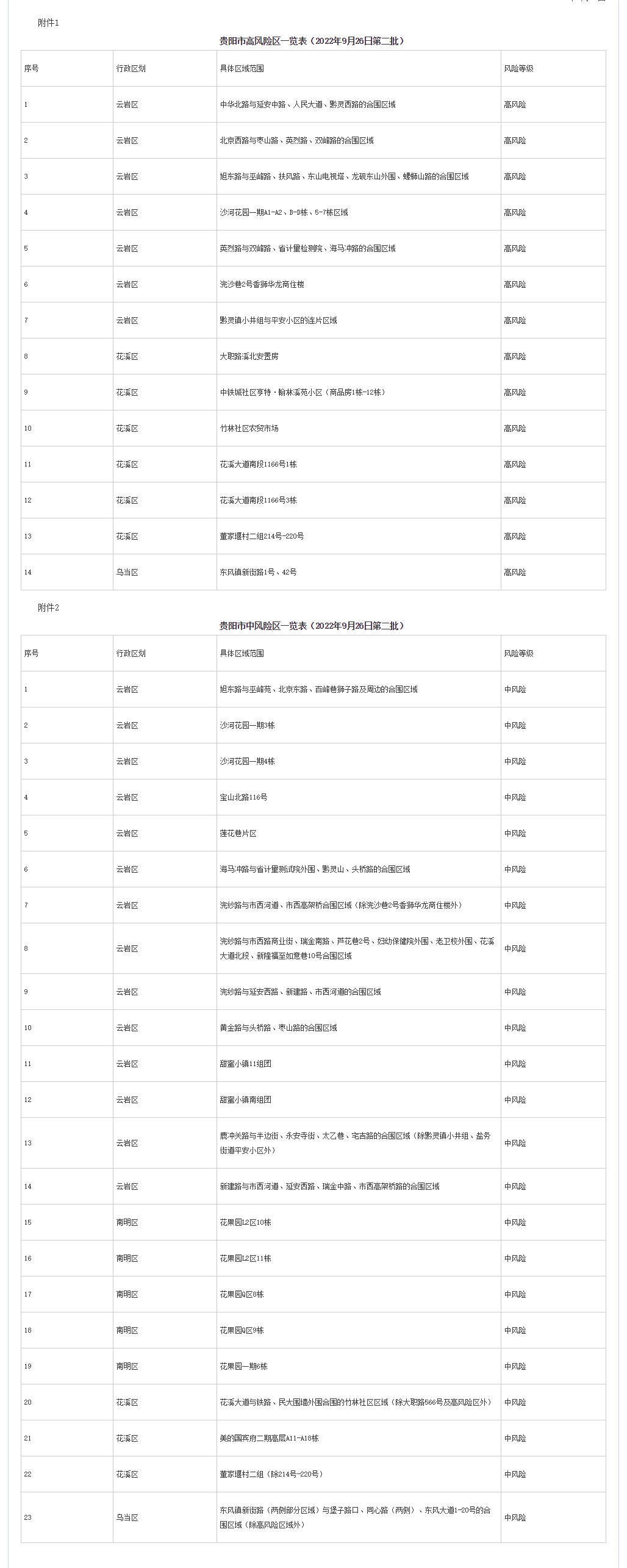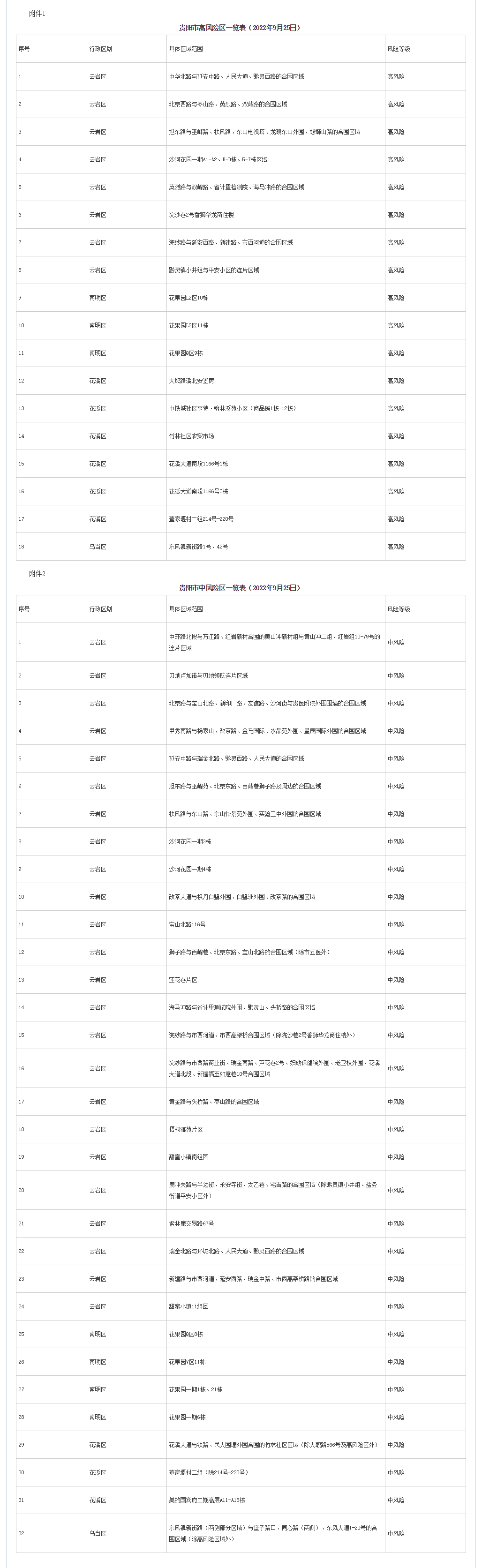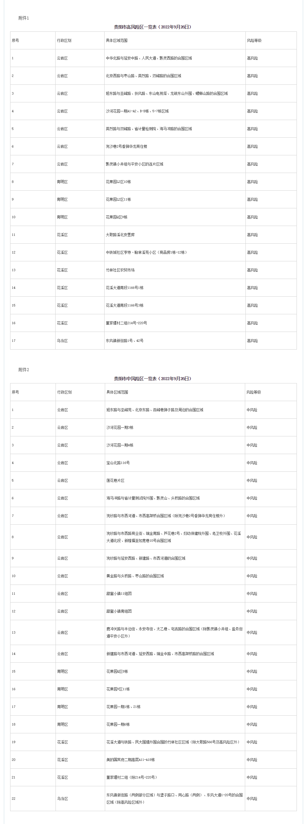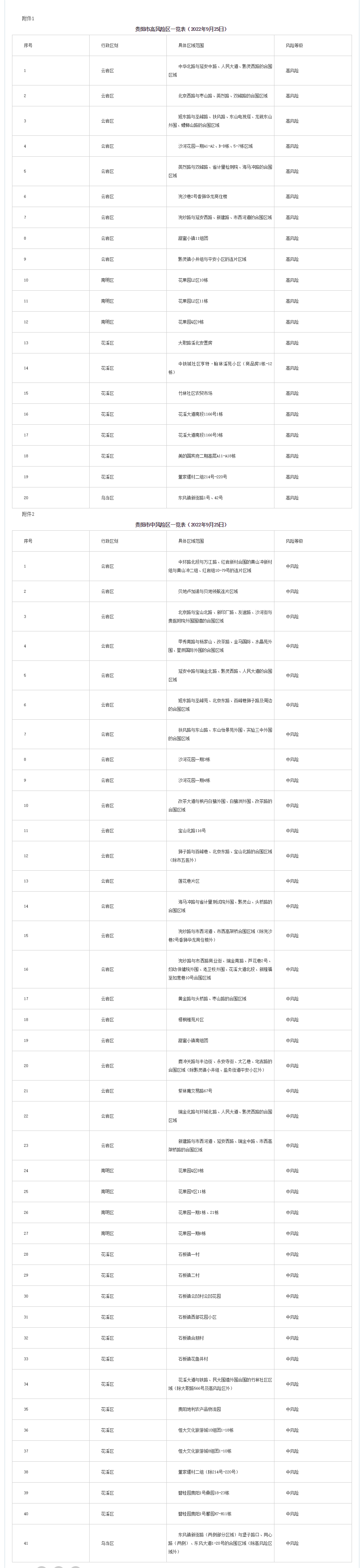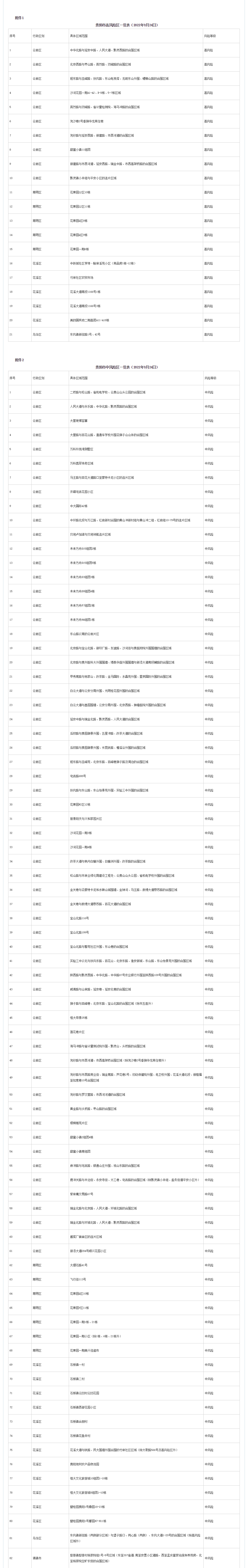 根據當前疫情防控形勢,為快速有效阻斷疫情傳播,實現科學精準防控,切實保障轄區內群眾生命安全和身體健康,逐步有序恢復正常生產生活秩序,按照《新型冠狀病毒肺炎防控方案(第九版)》《貴陽市高風險區疫情防控攻堅指導方案》相關要求,經專家組研判,即日起,將云巖區中高風險區調整如下: 一、高風險區調整為中風險區(共1個) 浣紗路與延安西路、新建路、市西河道的合圍區域 二、中風險區調整為低風險區(共11個) 中環路北段與萬江路、紅巖新村合圍的黃山沖新村組與黃山沖二組、紅巖組10-79號的連片區域,貝地盧加諾與貝地領航連片區域,北京路與寶山北路、新印廠路、友誼路、沙河街與貴醫附院外圍圍墻的合圍區域,甲秀南路與楊家山、改茶路、金馬國際、水晶苑外圍、星辰國際外圍的合圍區域,延安中路與瑞金北路、黔靈西路、人民大道的合圍區域,扶風路與東山路、東山怡景苑外圍、實驗三中外圍的合圍區域,改茶大道與楓丹白鷺外圍、白鷺洲外圍、改茶路的合圍區域,獅子路與百峰巷、北京東路、寶山北路的合圍區域(除市五醫外),梧桐雅苑片區,瑞金北路與環城北路、人民大道、黔靈西路的合圍區域,紫林庵交易路67號。 以上區域范圍及管控要求將根據疫情形勢變化適時調整。