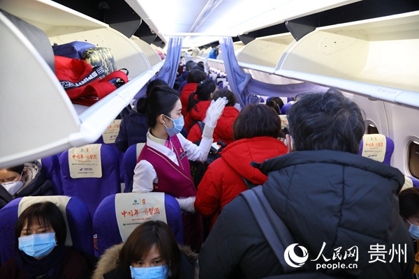 同時,航班從貴陽龍洞堡機場起飛后,民航貴州空管分局密切關注航班動態(tài),以保障航班安全迅速的到達防疫一線為宗旨,保障航班安全正點。當晚23時10分,全力確保航班安全、準點、順利起飛。截至1月28日凌晨1時整,該航班比原計劃提前22分鐘降落在武漢機場,共計137名貴州醫(yī)療隊人員平安抵鄂。(圖片由南航貴州提供)