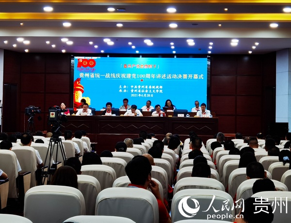 人民網貴陽6月28日電(王秀芳) 6月28日,貴州省統一戰線舉辦慶祝建黨100周年講述活動決賽,17支參賽隊伍攜36個作品登臺亮相。經過激烈角逐,來自貴州省社會主義學院的李靜梅、曹亞琪、黃維,畢節市委統戰部的朱璟然,民革貴州省委的劉光軍分別獲一等獎。