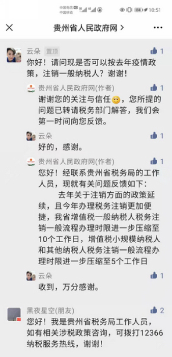 ——權(quán)威解答,共同分享,拓展延伸了惠企利民政策咨詢渠道。針對網(wǎng)友“云朵”留言“請問是否可以按去年疫情政策注銷一般納稅人”,第一時間作了詳細(xì)回答,并就今年更加便利的稅政稅服作了宣傳解讀,公開分享給更多網(wǎng)友。同時還邀請省稅務(wù)局相關(guān)工作人員在后臺補充留言“您好,我是貴州省稅務(wù)局工作人員,如有相關(guān)涉稅政策咨詢,可撥打12366 稅務(wù)服務(wù)熱線”,留言群眾多次追加評價“謝謝”“收到,萬分感謝”。政策百事通還收獲了一批“忠粉”,網(wǎng)友“漫畫”“青和”等對學(xué)籍檔案管理連續(xù)提問,運維協(xié)作小組會商后回復(fù)并設(shè)為精選,留言點贊 99 次的網(wǎng)友“沖涮記憶”,回復(fù)一連串的“國旗~擁抱~愉快”表情符。
