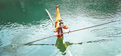起伏的江面上,駕一葉扁舟尚且不易,若是站到一根竹竿上漂流呢?再試想,身著層層舞衣,在竹竿上抬腿、下腰、轉圈,行進間自如表演呢?