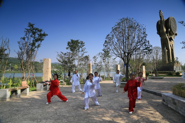 市民在觀山湖公園晨練。觀山湖區融媒體中心供圖