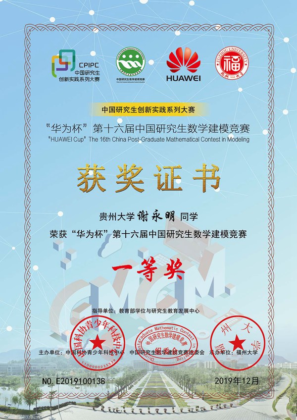 人民網貴陽12月24日電 近日,“華為杯”第十八屆中國研究生數學建模競賽成績揭曉。貴州大學電氣工程學院斬獲佳績,獲得全國一等獎1項,二等獎7項,三等獎5項。這也是學院連續三年喜獲該項賽事全國一等獎。