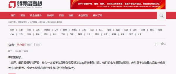 3月12日,務(wù)川自治縣發(fā)現(xiàn)一例輸入性新冠肺炎確診病例,截至3月17日18時,疫情已累計報告9例感染者,涉及5個家庭。3月14日起,務(wù)川對全縣各鄉(xiāng)鎮(zhèn)、街道、社區(qū)行政轄區(qū)范圍的交通等進(jìn)行管控,后續(xù)管控措施將視疫情防控情況及時調(diào)整。受該輪疫情影響,多名將在近期參加貴州省考的考生在人民網(wǎng)“領(lǐng)導(dǎo)留言板”向貴州省長留言。