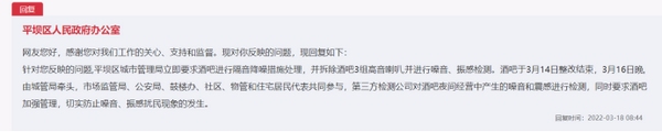 3月18日,平壩區(qū)相關(guān)部門就該網(wǎng)友留言回復(fù)稱,針對(duì)反映問(wèn)題,平壩區(qū)城市管理局立即要求酒吧進(jìn)行隔音降噪措施處理,拆除酒吧3組高音喇叭,并進(jìn)行噪音、振感檢測(cè)。