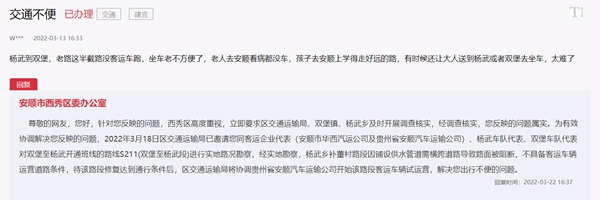 人民網(wǎng)貴陽3月24日電(王秀芳) 3月22日,貴州安順市西秀區(qū)一名網(wǎng)友在人民網(wǎng)“領(lǐng)導(dǎo)留言板”反映鄉(xiāng)鎮(zhèn)間缺乏公共交通、出行不便的留言獲辦理。