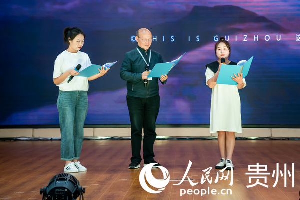 活動現場,原貴州省人大常委會副主任,貴州省高校鄉村振興研究中心顧問顧久先生與朗誦大賽獲獎學生代表朗誦一等獎作品《姑父的“甜蜜”事業》。人民網 涂敏攝