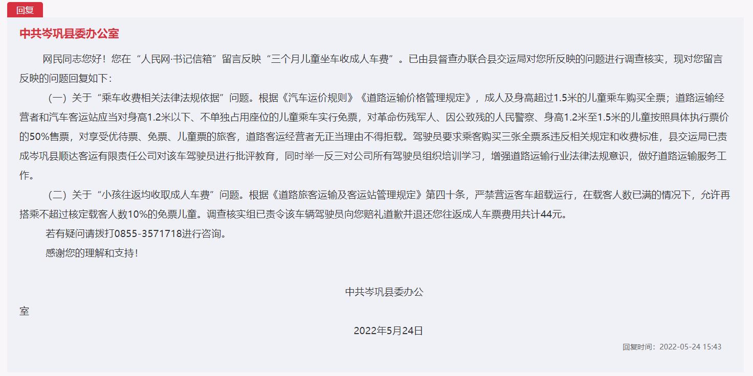 5月24日,岑鞏縣委辦公室就網友留言反映問題回復稱,根據《汽車運價規則》和《道路運輸價格管理規定》,成人及身高超過1.5米的兒童乘車購買全票;道路運輸經營者和汽車客運站應當對身高1.2米以下、不單獨占用座位的兒童乘車實行免票。駕駛員要求乘客購買三張全票系違反相關規定和收費標準,縣交運局已責成岑鞏縣順達客運有限責任公司對該車駕駛員進行批評教育,同時舉一反三對公司所有駕駛員組織培訓學習,增強道路運輸行業法律法規意識,做好道路運輸服務工作。