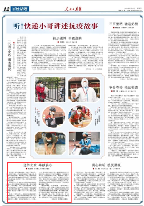 特殊時期,我們快遞從業人員成了物資保供的關鍵一環。我和我的同事們都堅守在崗位,奔波在城市的大街小巷。我們爭分奪秒地干活,心里想著:我們抓緊送,需要的人就能早點收。