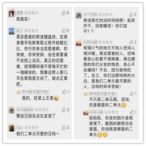 自本輪貴陽疫情發生后,類似謠言屢有發生,如網友未經仔細辨別和求證就進行轉發傳播,不僅會導致以訛傳訛,助長謠言,也會寒了一線抗疫志愿者的心。對此,網友“貴州娛樂貓”表示:“越看越生氣”。他在自己的微信公眾號平臺發文稱:很多志愿者是真的很辛苦,男的好一點,女生經常被情緒失控的業主懟哭。“還有人黑志愿者,說利用克扣妹子的物資來要挾妹子。我就想問問,負責分發統計的副組長會看不到?負責敲門的會看不到?”不少網友點贊了他的這條微信推文,并在評論區留言支持。