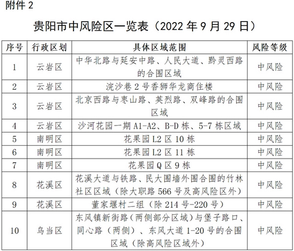 根據(jù)當(dāng)前疫情防控形勢(shì),為快速有效阻斷疫情傳播,實(shí)現(xiàn)科學(xué)精準(zhǔn)防控,切實(shí)保障轄區(qū)內(nèi)群眾生命安全和身體健康,逐步有序恢復(fù)正常生產(chǎn)生活秩序,按照《新型冠狀病毒肺炎防控方案(第九版)》《貴陽市高風(fēng)險(xiǎn)區(qū)疫情防控攻堅(jiān)指導(dǎo)方案》相關(guān)要求,經(jīng)專家組研判,自9月29日0時(shí)起,將云巖區(qū)、花溪區(qū)中高風(fēng)險(xiǎn)區(qū)調(diào)整如下: