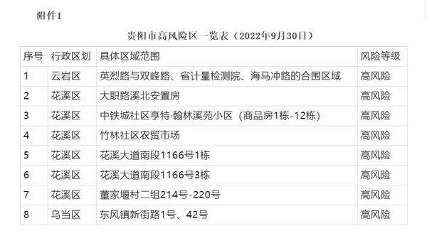 附件:1.貴陽市高風險區一覽表(2022年9月30日)