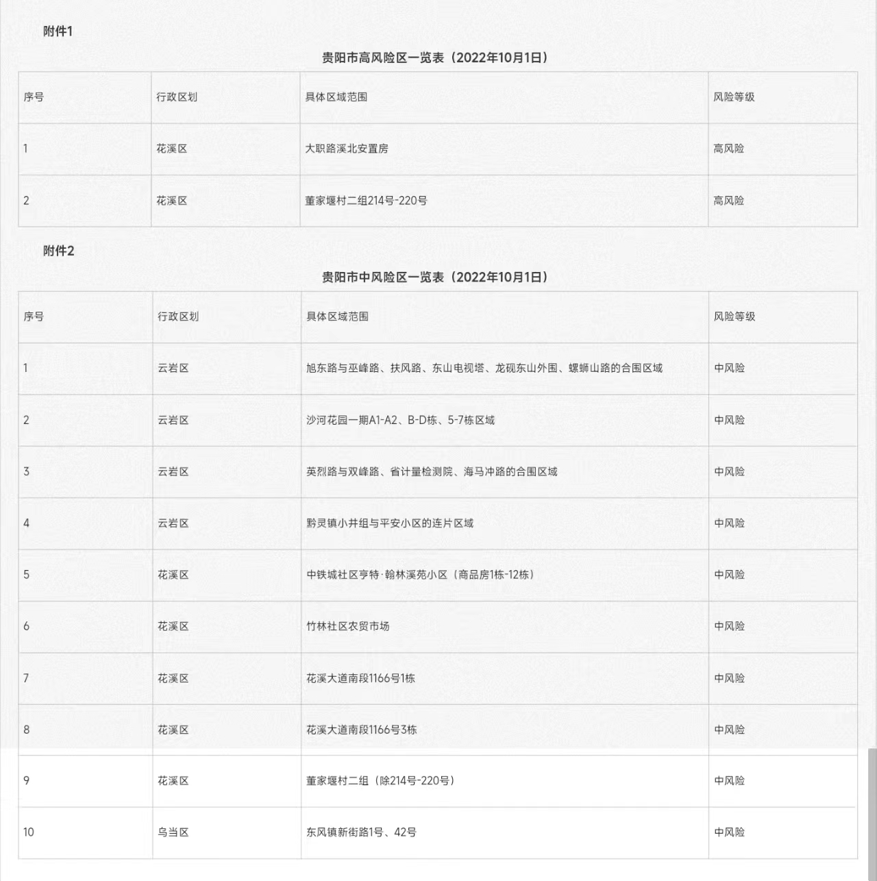 1.貴陽市高風險區一覽表(2022年10月1日)