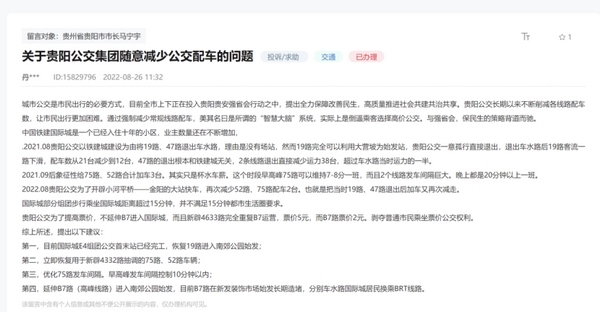 急難愁盼 | 貴州貴陽(yáng)一網(wǎng)友反映公交運(yùn)營(yíng)問(wèn)題獲列清單回復(fù)辦理