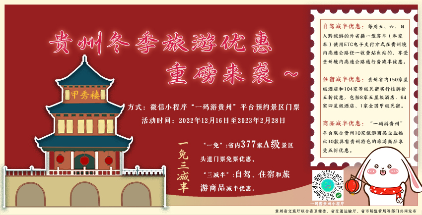不再查核酸、取消落地檢、行程碼下線……當煙火氣回歸,又遇兔年春節長假,人們不遠千里回到家鄉,在熱鬧的爆竹聲中出游意愿更為強烈。過年去哪玩?哪的優惠大?滑雪溫泉要安排!除了冬游貴州“一免三減半”的優惠政策,還有部分地方推出的冬游優惠政策,可謂是“折上折”。快來收下這份貴州春節旅游指南吧!