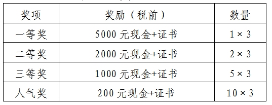 大賽每個競賽單元分別設置入圍獎(人氣獎)、三等獎、二等獎、一等獎4類獎項,3個競賽單元總計頒發(fā)54個獎項。獎勵由現(xiàn)金及證書等組成。獎項設置(共3個單元):