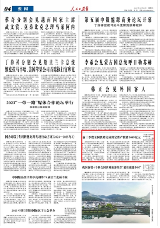 本報北京10月19日電 (記者嚴冰)從中國國家鐵路集團有限公司(以下簡稱“國鐵集團”)獲悉,前三季度,全國鐵路完成固定資產投資5089億元、同比增長7.1%,投產鐵路新線1402公里,其中高鐵1276公里,為推動經濟持續回升向好提供了有力支撐。