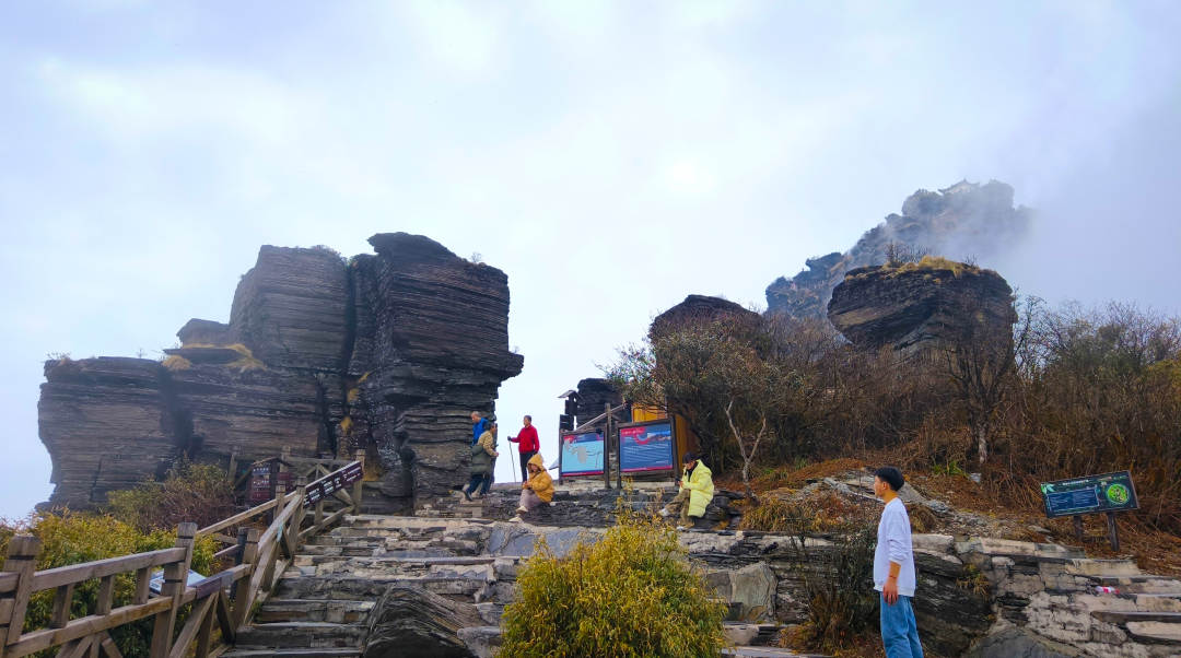 梵凈山景區(qū)內(nèi)孤峰突兀,億萬年的風(fēng)雨侵蝕,雕琢了老金頂附近的高山石林峰群,諸如“蘑菇石”“老鷹巖”“萬卷書”“將軍頭”等,鬼斧神工,惟妙惟肖,妙趣天成。