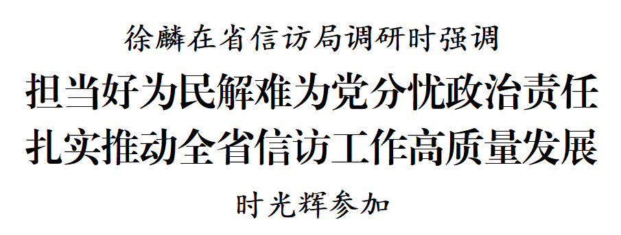 4月30日,省委書記、省人大常委會主任徐麟到省信訪局調研。他強調,要持續深入學習貫徹習近平總書記關于加強和改進人民信訪工作的重要思想,自覺踐行以人民為中心的發展思想,擔當好為民解難、為黨分憂的政治責任,扎實推動我省信訪工作高質量發展,更好維護全省社會大局和諧穩定。省委副書記、省委政法委書記時光輝,省委常委、省委秘書長郭錫文參加。
