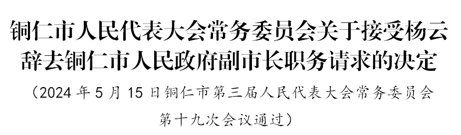 接受楊云辭去銅仁市人民政府副市長職務的請求,報銅仁市第三屆人民代表大會第五次會議備案。