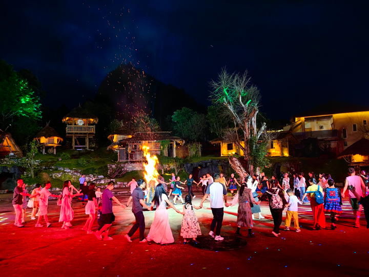 篝火熊熊燃燒,大家手拉手圍成一個大圓圈,隨著音樂的節(jié)奏盡情舞動,火光閃爍,映照著每一張歡快的臉龐,煙火氣息彌漫著小山村,爆棚的人氣點燃了瑤山古寨之夜……