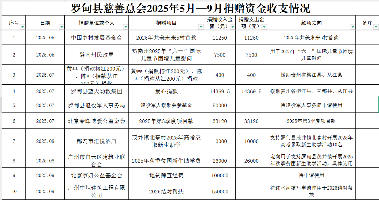羅甸縣慈善總會(huì)2025年5月—9月捐贈(zèng)資金收支情況