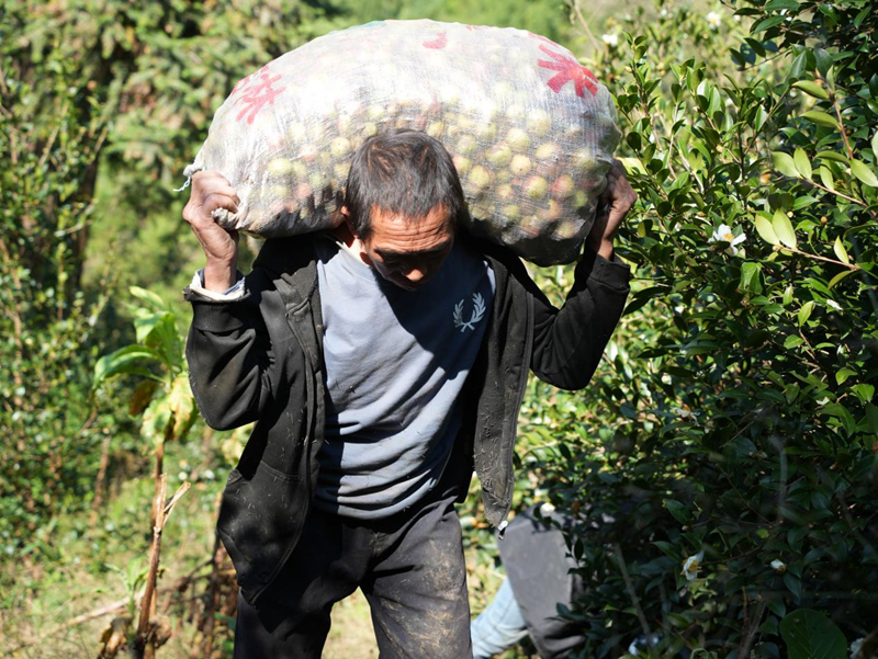 德江縣平原鎮油茶種植戶毛賢桃告訴筆者:“我們油茶有40多畝,已經快打完了,預計有7000多斤,年年都是運到這里來賣,這里也方便,運過來也不費力。”