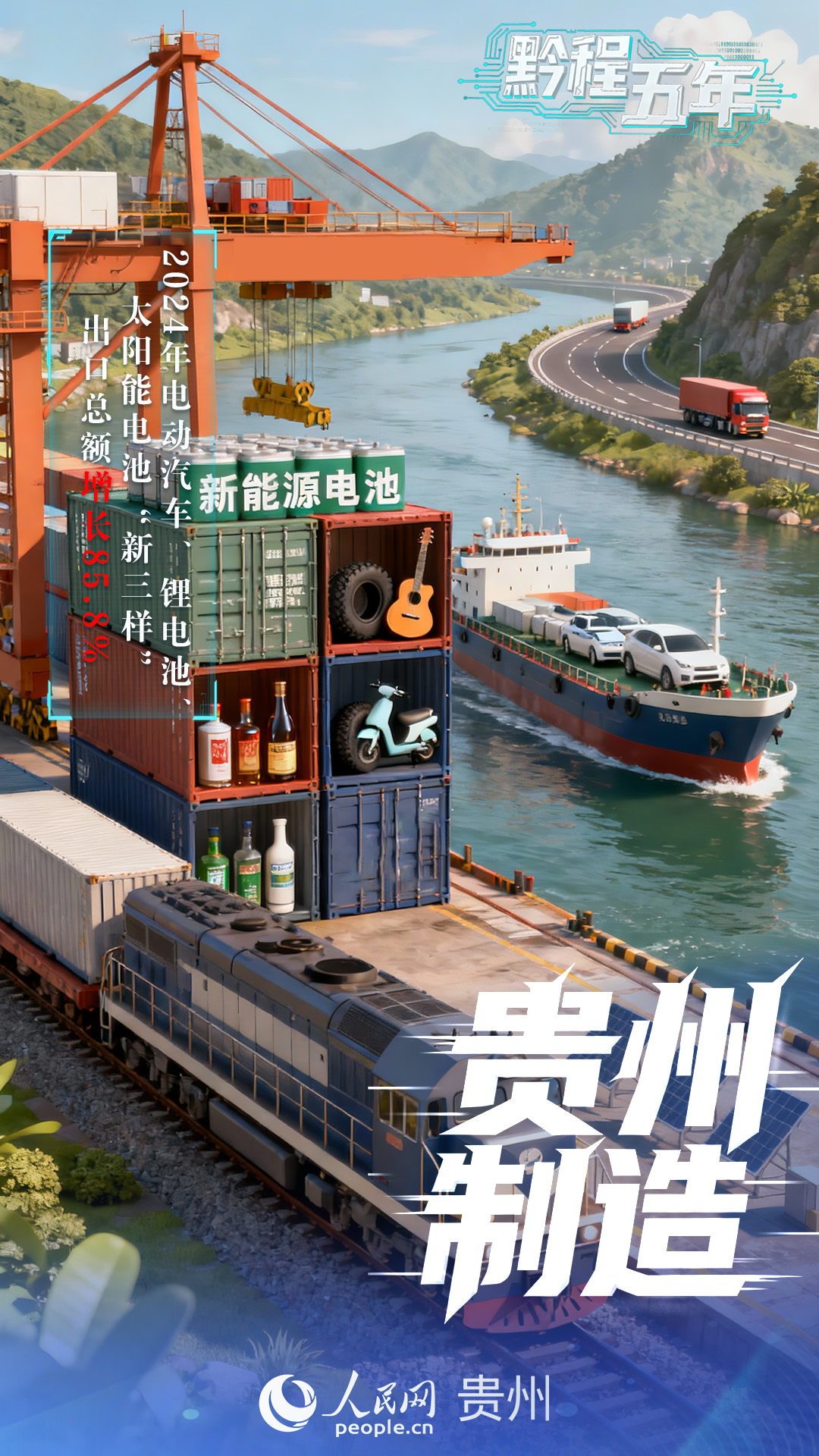 用好西部陸海新通道建設(shè)機(jī)遇,以東南亞、南亞、中亞為重點(diǎn)擴(kuò)大對(duì)外開(kāi)放,推動(dòng)新能源電池、白酒、輪胎、吉他等“貴州制造”走向國(guó)際市場(chǎng),2024年電動(dòng)汽車、鋰電池、太陽(yáng)能電池“新三樣”出口總額增長(zhǎng)85.8%。